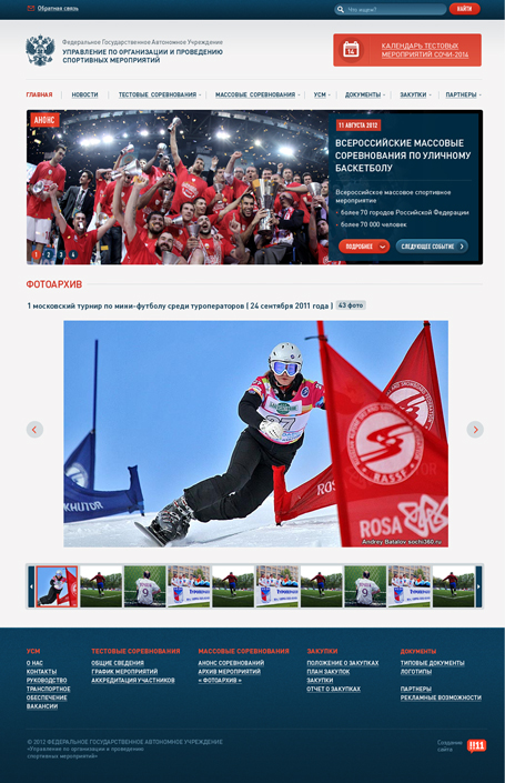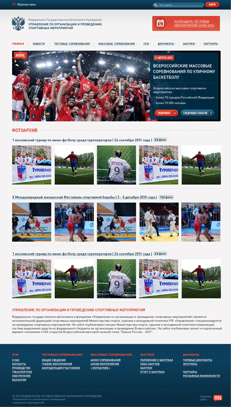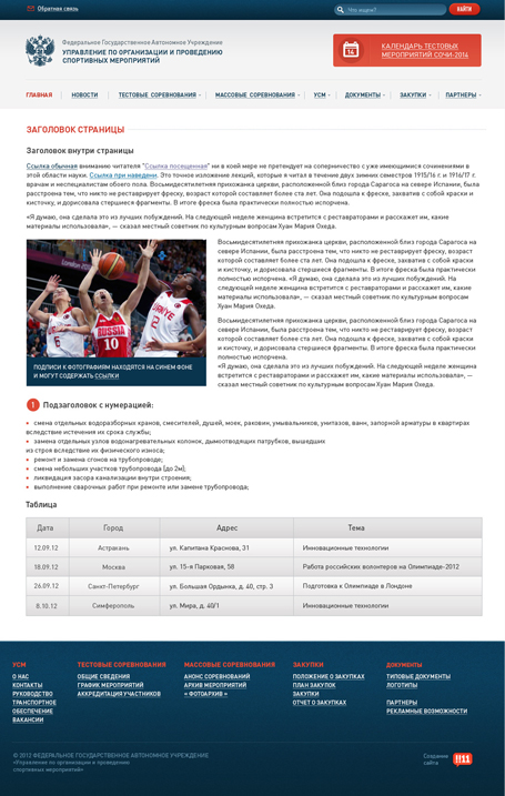 Для удобства редактирования материала созданы несколько ролей контент-менеджеров, каждая роль отвечает за свой раздел на сайте. Также был разработан календарь спортивных мероприятий, контент-менеджер, отвечающий за календарь, имеет возможность в интерактивном виде заполнять ячейки календаря и стилизовать их при помощи заготовленных дизайнером шаблонов.
